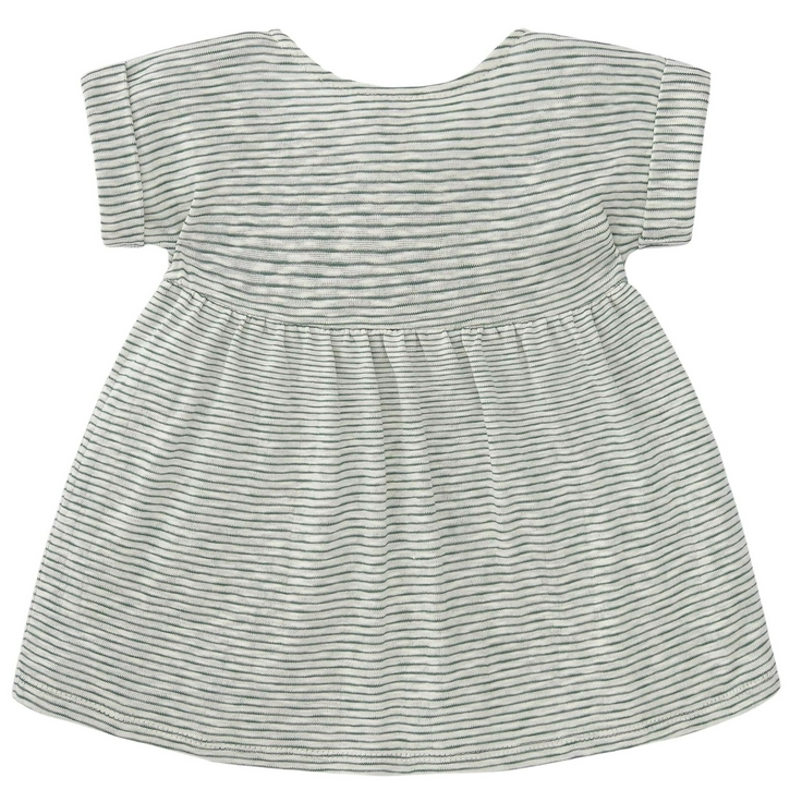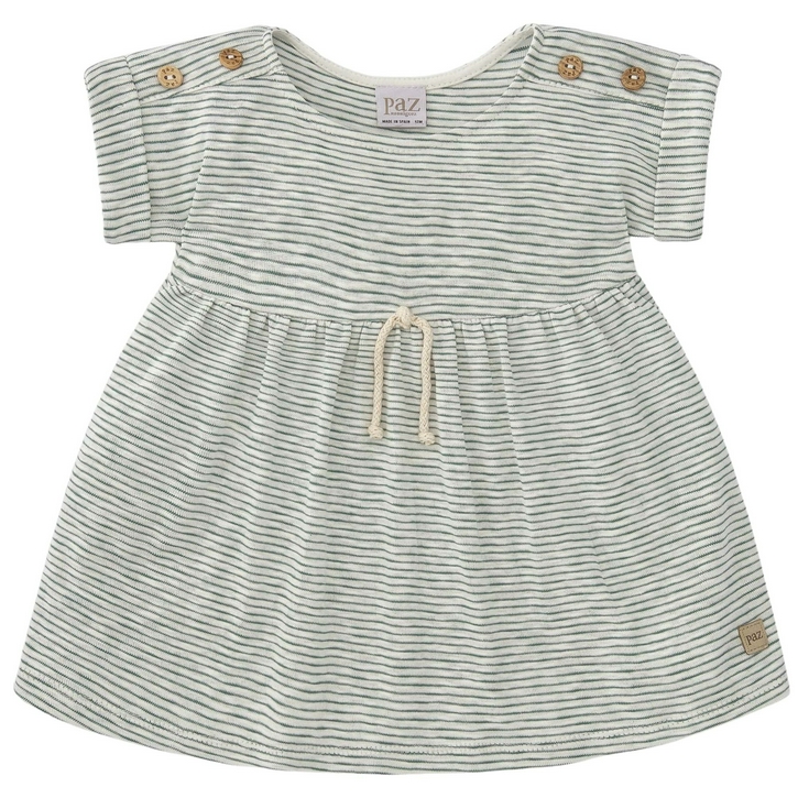Meisjesjurk in rustieke stijl met houten knoopdetail op de schouders. Omgeslagen korte mouwen en decoratief kant. Ronde nek.