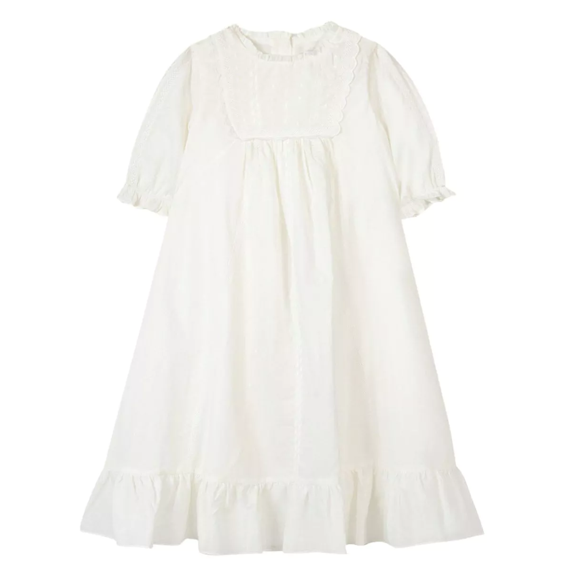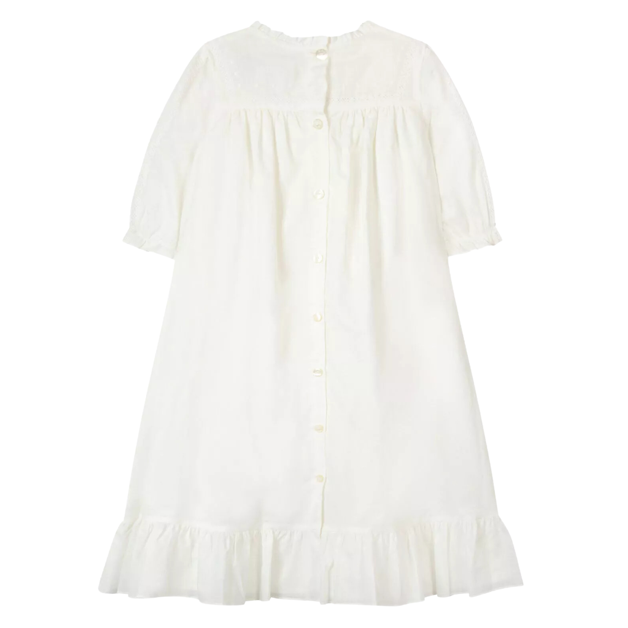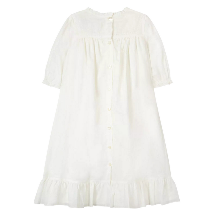 Licht gepofte mouwen en strakkere polsen die de jurk licht maken en de ritssluiting aan de achterkant die het aankleden van de baby gemakkelijker maakt.