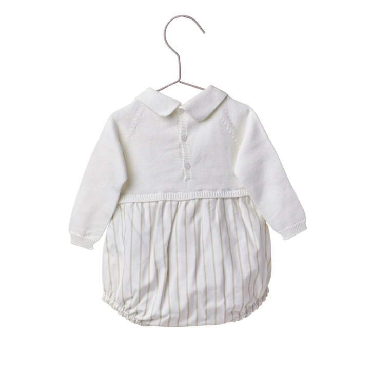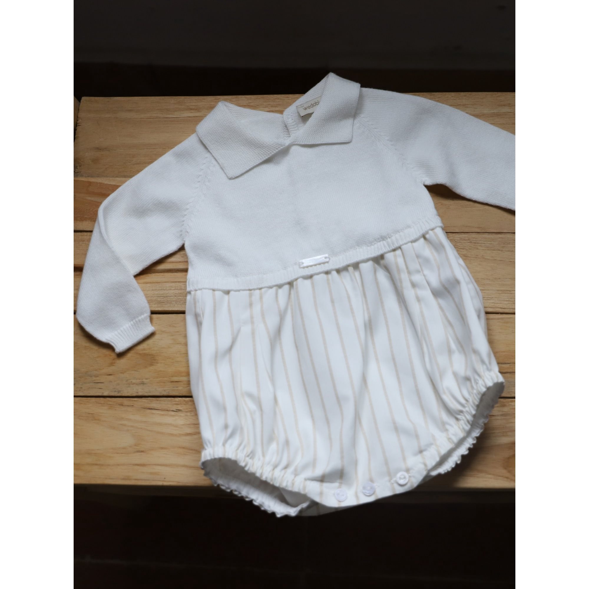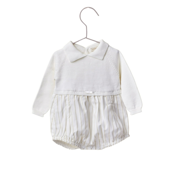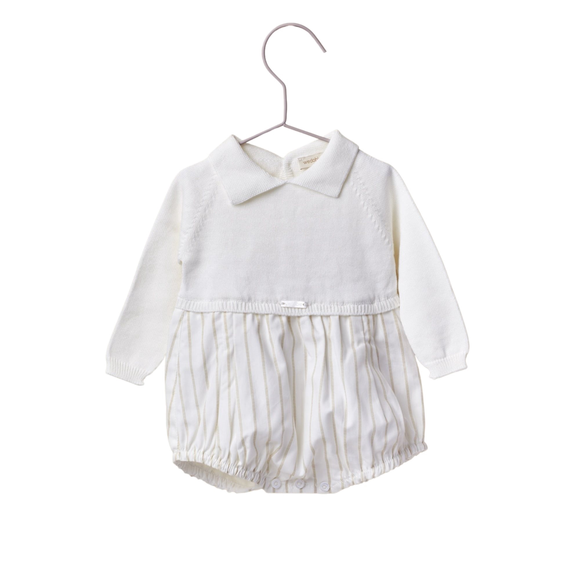 Poloshortie met lange mouwen, ideaal voor pasgeboren jongens en meisjes tot 24 maanden. Poloshortie is zacht gebreid in parel fijn zacht en ademend biologisch katoen. Het beige en ivoor gestreepte broekje is gevoerd voor comfort. Er zitten parelmoer knoopsluitingen op de rug en tussen de benen.