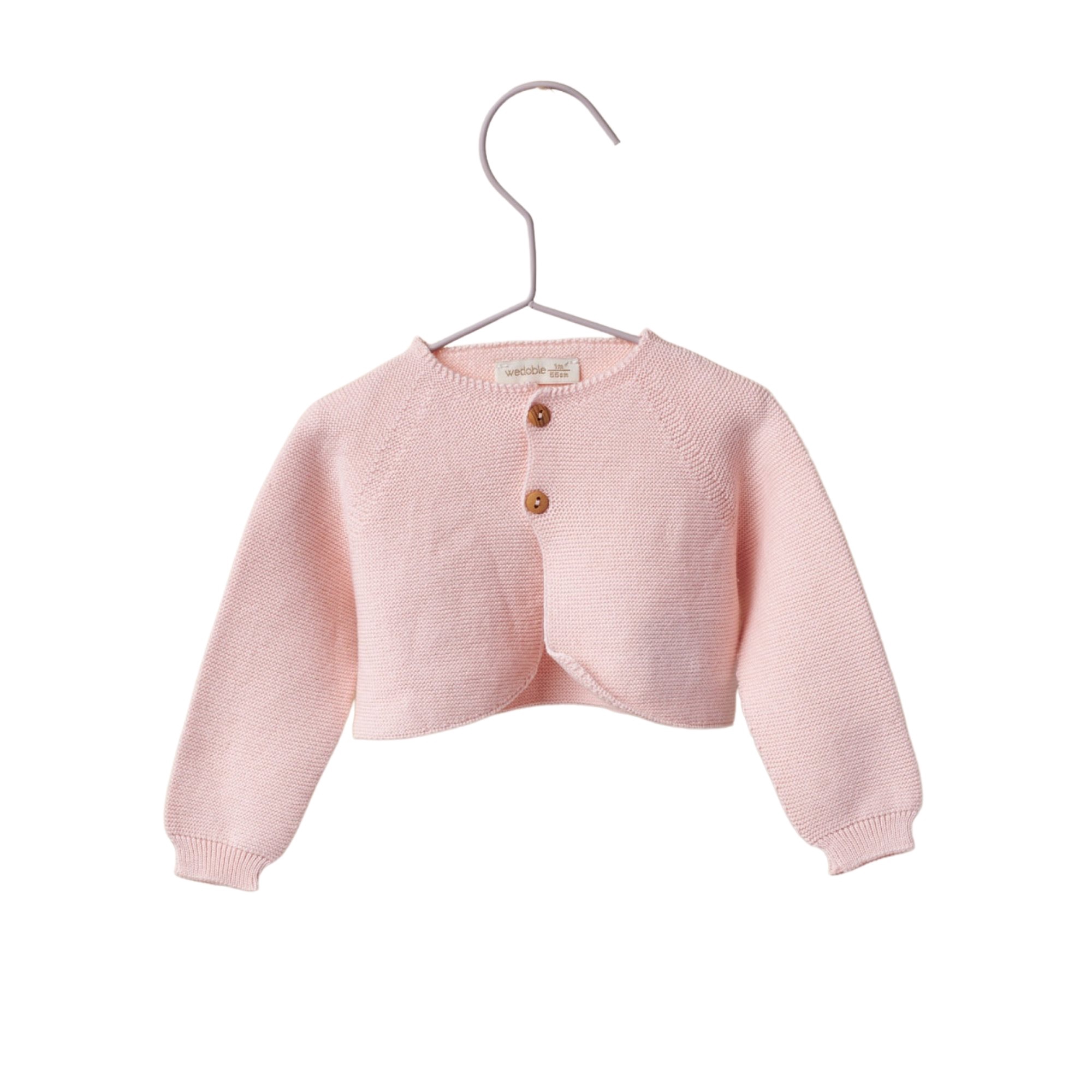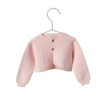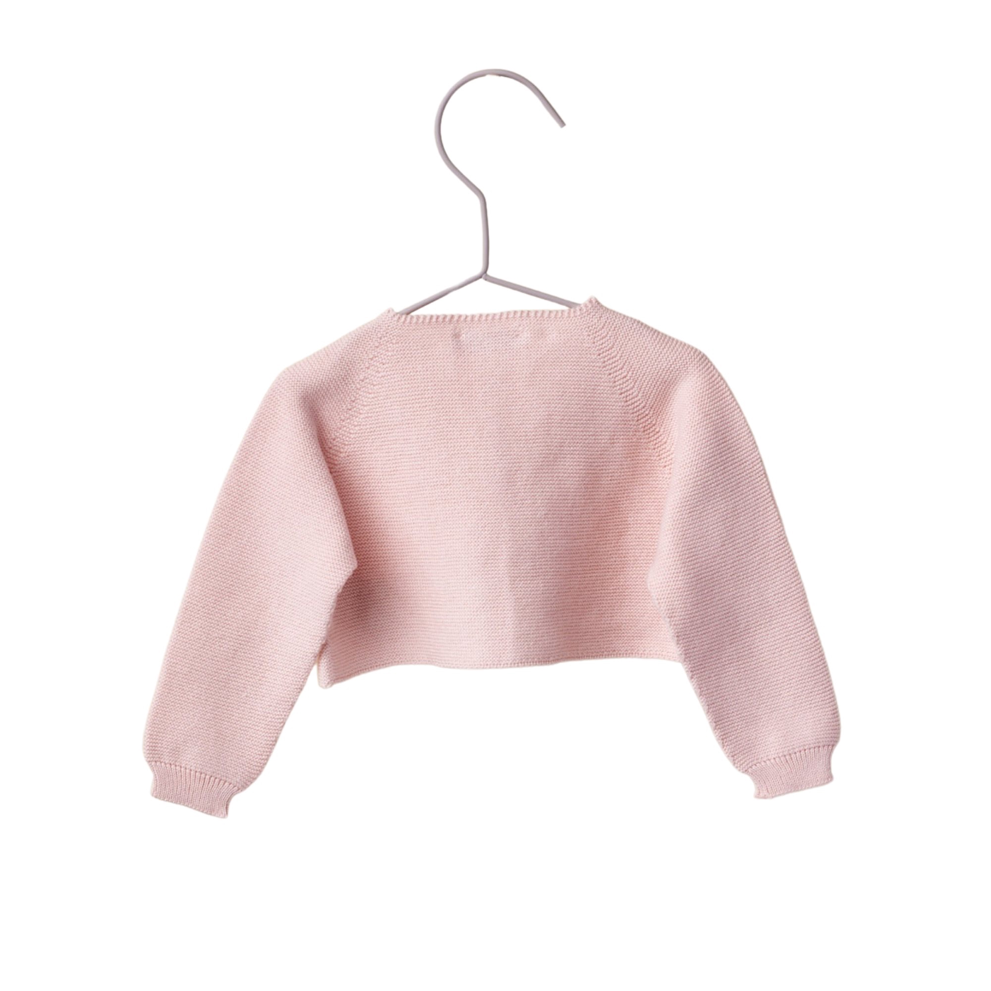 Kort vestje met lange mouw gebreid van heerlijk zacht katoen, ideaal voor babymeisjes tot 4 jaar. Fijn mesh vest met lange mouwen (bolero) met ronde hals sluit aan de voorzijde met houten knopen.